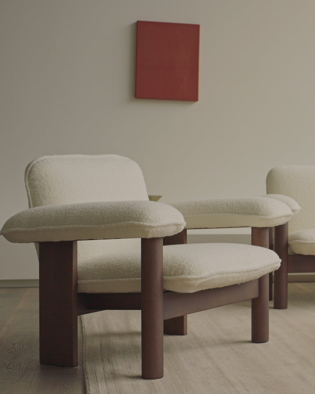Built with a solid oak base, the Brasilia Lounge Chair features a high-quality steel frame wrapped in molded foam for durability and support. Upholstered in Baru fabric, the sofa boasts an ultra-soft woven woolen bouclé that evokes the sensation of shorn fleece. The elasticity of the wool fibers and unique finishing processes impart a comforting volume to the material. Baru offers the benefits of a woolen textile with an exceptionally soft feel. The bouclé texture, coupled with a subtle shine from the acrylic blend, creates a playful effect as the color captures and reflects light.