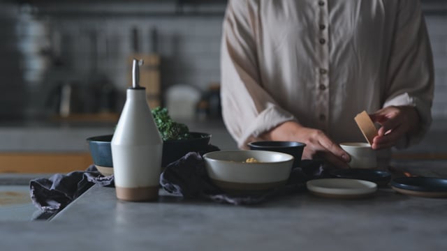 Kinto's ceramic tableware is made entirely by hand in a traditional pottery village in Nagasaki, Japan. Crafted for daily use each piece consists of clay composed of sandstone: a mix of sand and rocks with Amakusa porcelain stone mined from Japan's Amakusa islands. This clay is durable for daily use and also allows for each piece to have nuanced expressions created by the iron in the sandstone reacting with the glaze.